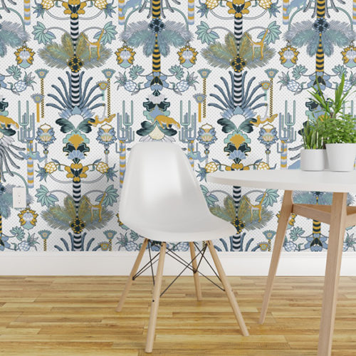 Ce motif Jungle s’éloigne du traditionnel décor tropical et évoque un monde fantastique recouvert d’étranges colonnes végétales mi-fleur mi-arbre. Une faune liliputienne parcourt nonchalamment ces plantes monumentales.